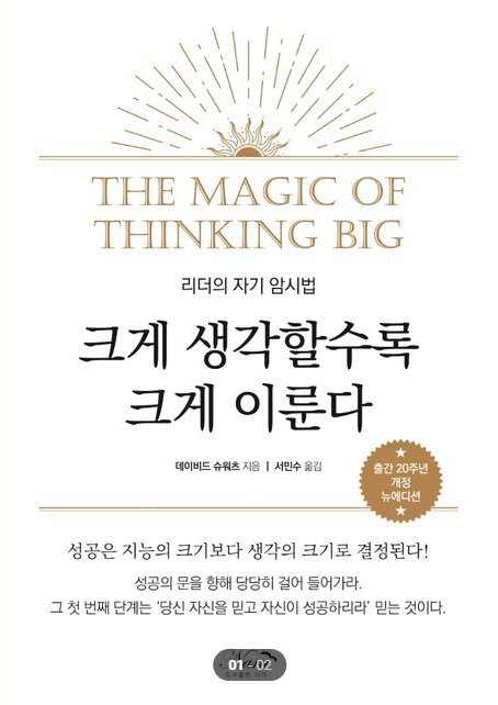 작가데이비드 슈워츠(David J.Schwartz)는 '크게 생각할수록 크게 이룬다', 바로 이 책에서 인생에서 성공을 거두기 위한 핵심 요소로 자신을 믿는 것의 중요성을 강조한다. 그는 우리의 자아상과 우리가 우리 자신에 대해 가지고 있는 믿음이 우리의 잠재력을 제한하거나 우리의 목표를 향해 나아가게 할 수 있다고 주장한다.